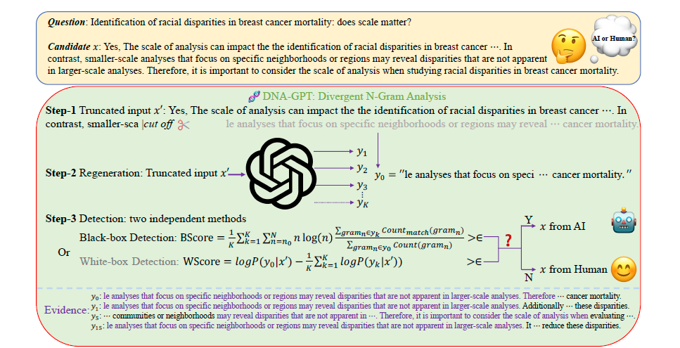 Divergent N-Gram Analysis, or “DNA-GPT,” focuses on the idea that GenAI produces identical text throughout numerous generations, while human writing displays a more versatile distribution. As an experiment showed, this zero-shot method outperforms the ZeroGPT model.