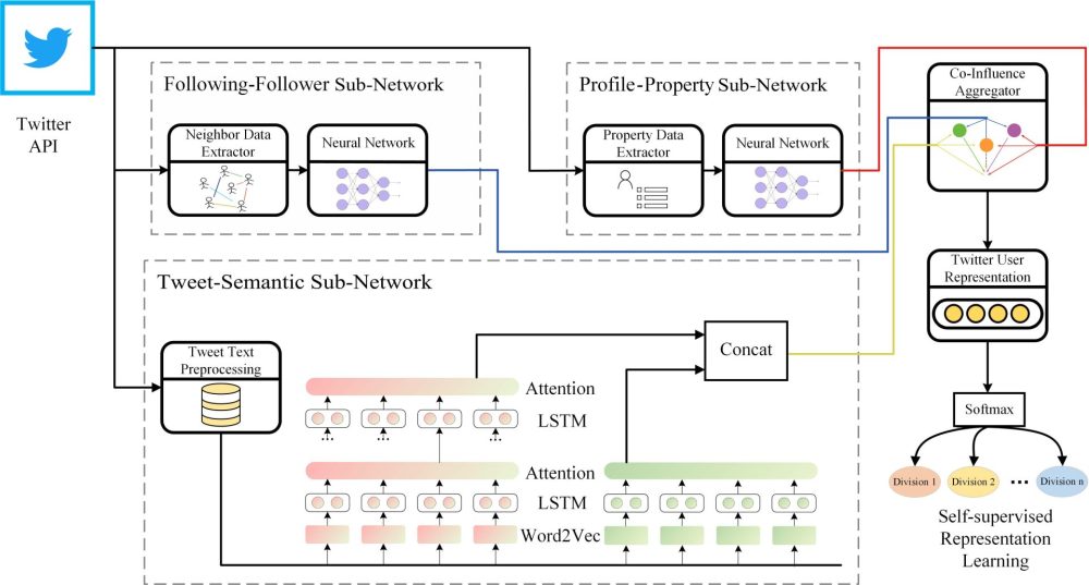 This method is based on a self-supervised representation learning framework. It’s capable of encoding tweet, property, and neighborhood information related to a user, while also using the follower count as the primary self-supervised signal for training. The model consists of four elements: 1) tweet-semantic subnetwork 2) profile-property subnetwork 3) following-follower subnetwork 4) co-influence aggregator.