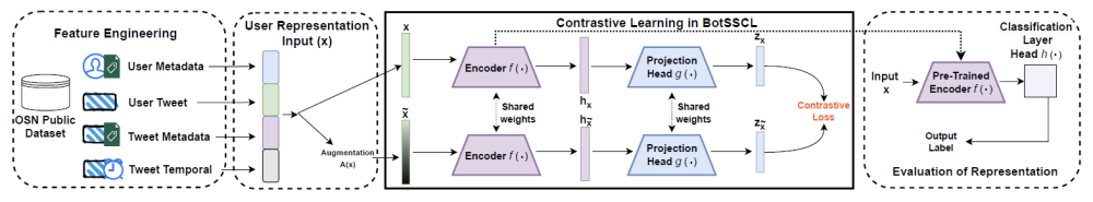 BotSSCL stands for Bot detection with Self-Supervised Contrastive Learning. It employs contrastive learning, which separates human users from bots by analyzing four social account feature types: Metadata with unique statistics, Tweets represented as embeddings, Tweet Metadata including likes, comments and retweets, as well as Tweet Temporal that analyzes account’s behavior and posting frequency.