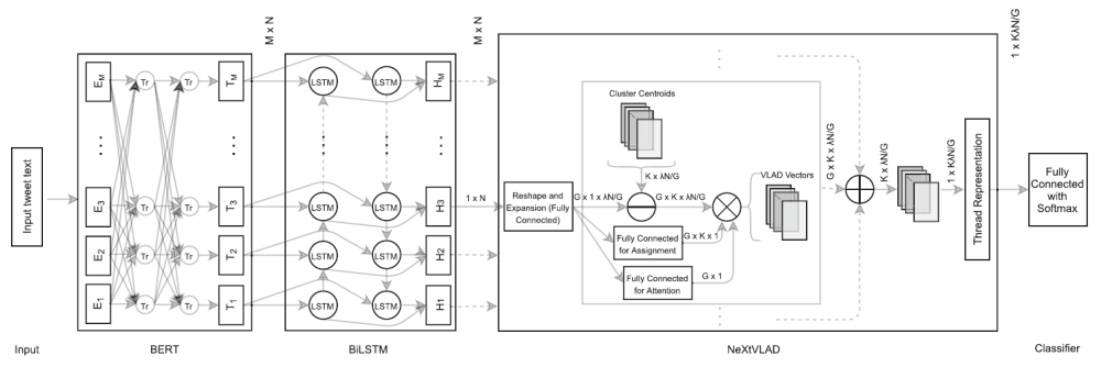 This approach suggests that Natural Language Processing (NLP) is the most promising method to fight fake texts, as it can detect them in real time before they can spread throughout social media. The model comprises BERT, Bidirectional LSTM for detecting temporal relations, efficient neural network NeXtVLAD, and Bag of Visual Words for data encoding.