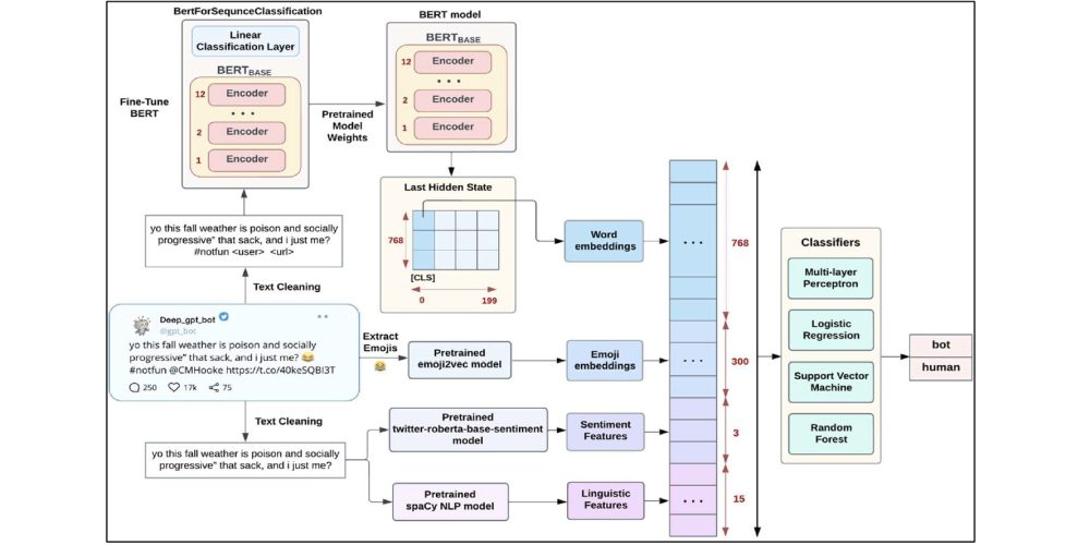 This is a comprehensive approach which focuses on the additional linguistic features present within the text. These would include positive, negative, or neutral sentiment, semantic features of a tweet, emoji usage, analysis of adjectives, nouns, punctuation, and other linguistic features. The model itself is based on BERT, with addition of Multi-Layer Perceptron, logistic regression, support vector machines, and random forest.