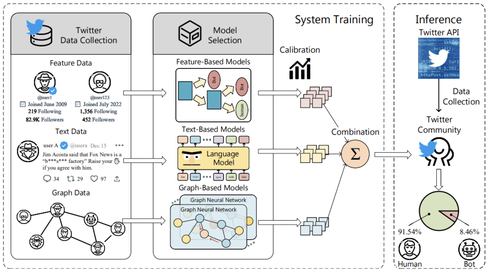 BotPercent offers a collective approach to bot detection, as it focuses on entire communities where bots can be active, rather than individual cases. Its model absorbs multiple detection components, including those which are text-based, features, or graph-based.