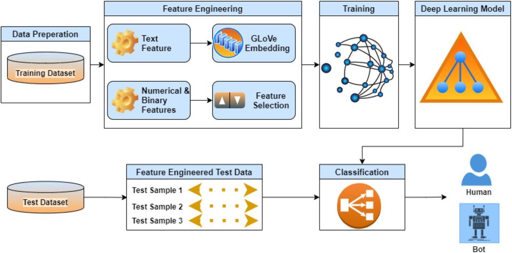 DeeProBot focuses on the profile features of a user, namely its description. It employs pre-trained Global Vectors (GLoVe) to provide word representations, as well as long short-term memory (LSTM) with the addition of dense layers, so the model can process diverse input.