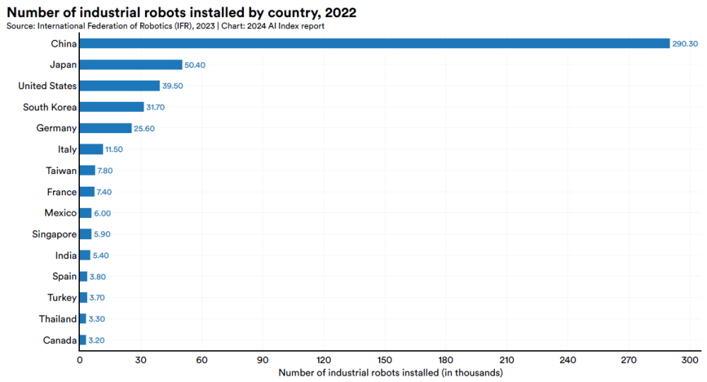 Asian countries — namely China and Japan — are the leaders at introducing industrial robots with China deploying 290,300 units. The US is in third place with 39,500 units.