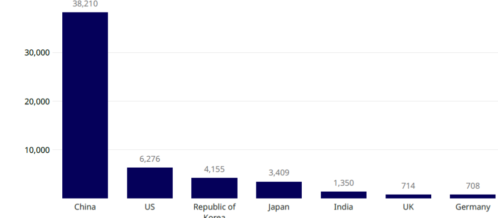 According to the AI Index Report, in the period from 2021 to 2022, the overall number of AI patents increased by 62.7%. Currently, China is the indisputable leader in a number of AI patents. As reported by WIPO: the country has produced 38,000 inventions related to GenAI. At the same time, the US and China march in a lockstep in terms of scientific publications on the topic.