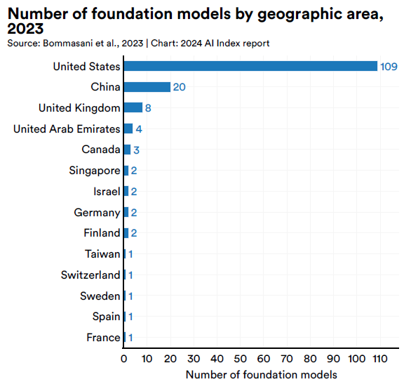 Foundation models (FMs) are a type of AI that is trained on a gargantuan corpus of data that contains billions of samples. Unlike task-specific AI that focuses on a single problem, foundation models can handle multiple tasks at the same time. Currently, the US ranks first among the nations who develop their own FMs as the country is a home to the world’s biggest tech companies: Amazon, Google, Anthropic, OpenAI, etc.